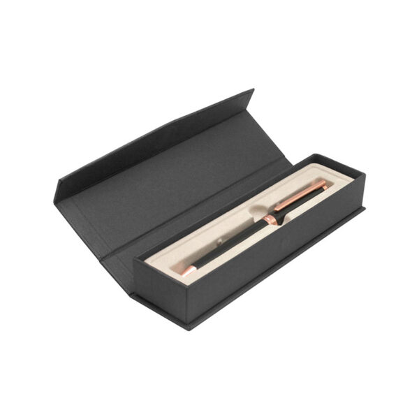Su sistema de apertura giratoria ofrece una experiencia de uso fluida y precisa, acompañada de tinta negra para un trazo nítido y profesional. Se presenta en un estuche con cierre magnético, ideal para regalos corporativos de alto nivel.