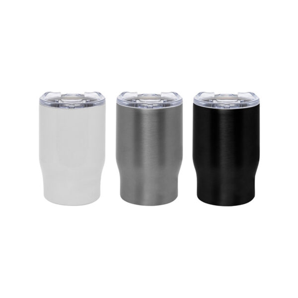 Confeccionado en acero inoxidable con doble pared (interior 304 y exterior 201), este mug mantiene la temperatura de tus bebidas por más tiempo. Su tapa plástica transparente a presión, equipada con anillo de silicona, ofrece un cierre firme que evita derrames.